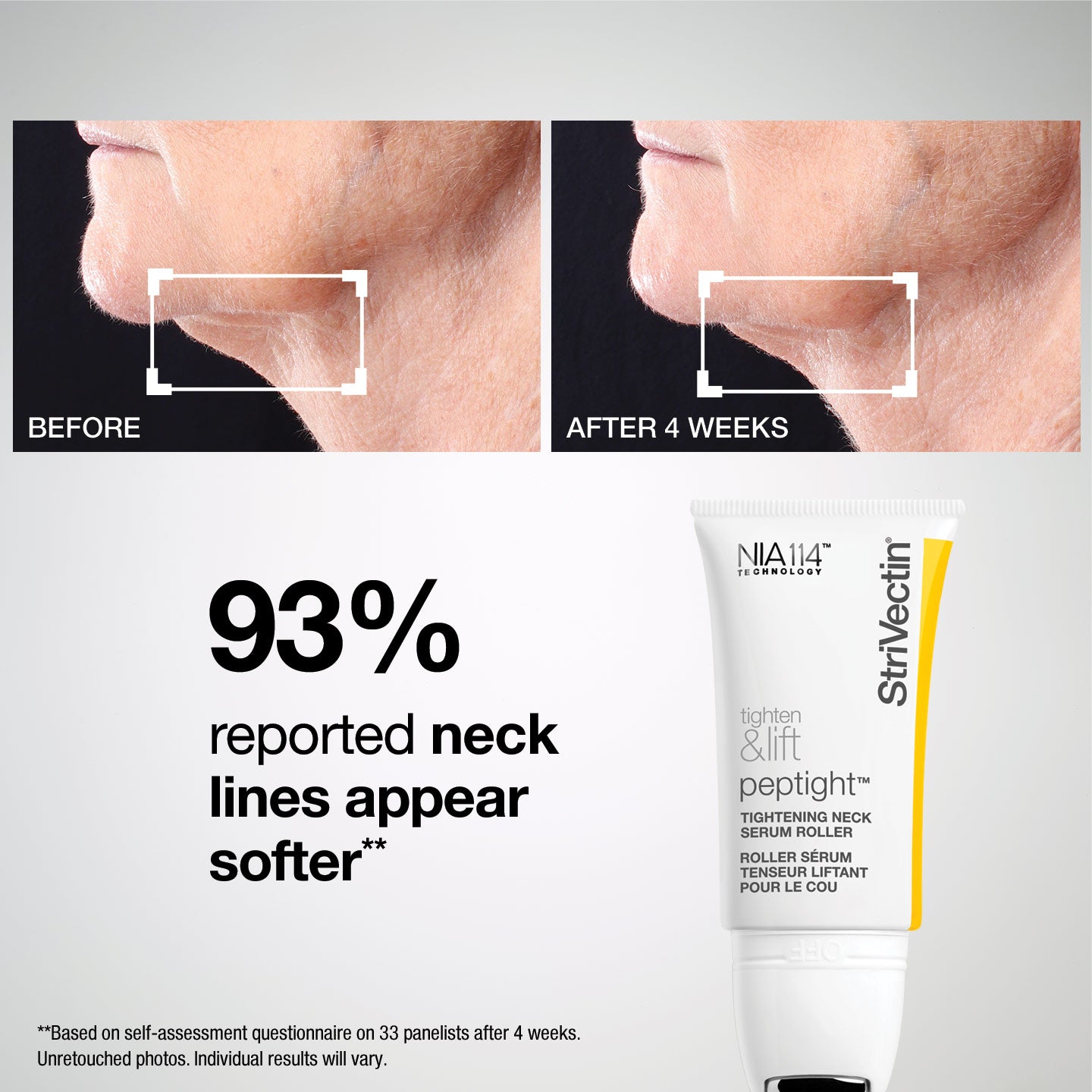 - Turn Peptight™ Tightening Neck Serum Roller applicator to ON position and lightly squeeze to release serum. Return applicator to OFF position and gently roll a thin layer over neck and under jawline in an upward motion, patting in any excess until absorbed. Use both morning and evening.